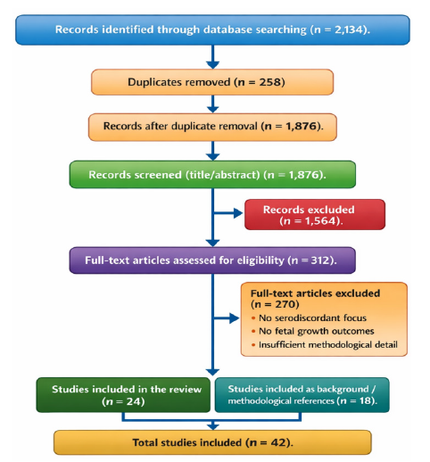 The screening process followed PRISMA guidelines. Titles and abstracts were independently reviewed by two researchers, with disagreements resolved by consensus. Full-text screening was then conducted to confirm eligibility. Ultimately, 42 studies met the inclusion criteria, spanning diverse geographic regions including Sub-Saharan Africa, Asia, and Latin America. This process ensured that the review captured both mechanistic and clinical perspectives on the intersection of HIV, psychosocial stress, and fetal growth10-12.